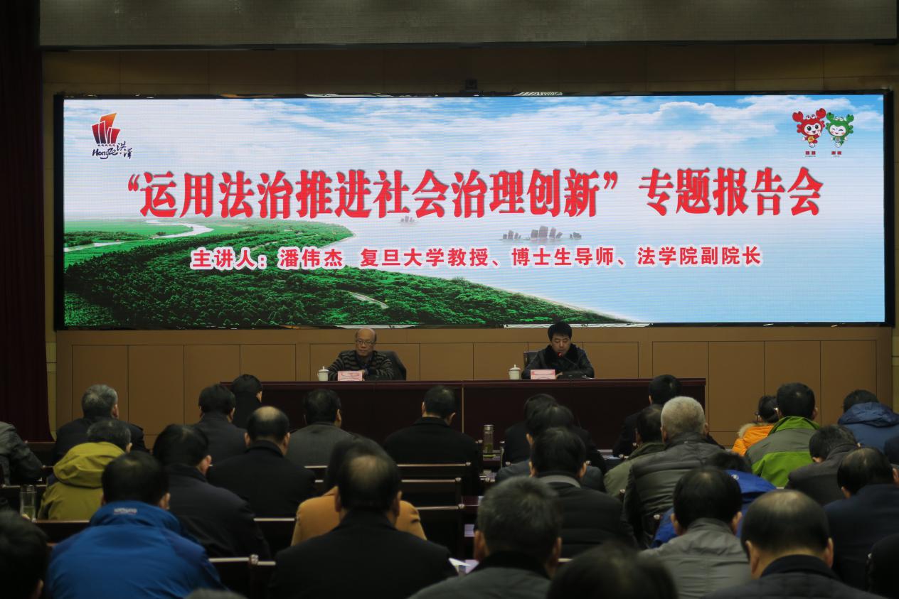 近日,淮安市洪泽区举办“双百”报告会。复旦大学教授、博士生导师、法学院副院长潘伟杰应邀以“运用法治推进社会治理创新”为题作专题报告。区委常委、统战部长张春荣主持会议,区四套班子分管领导、区政法各机关、部门班子成员、各镇、街道主要领导、政法委书记、综治办主任、区直各部门主要负责人参加会议。
