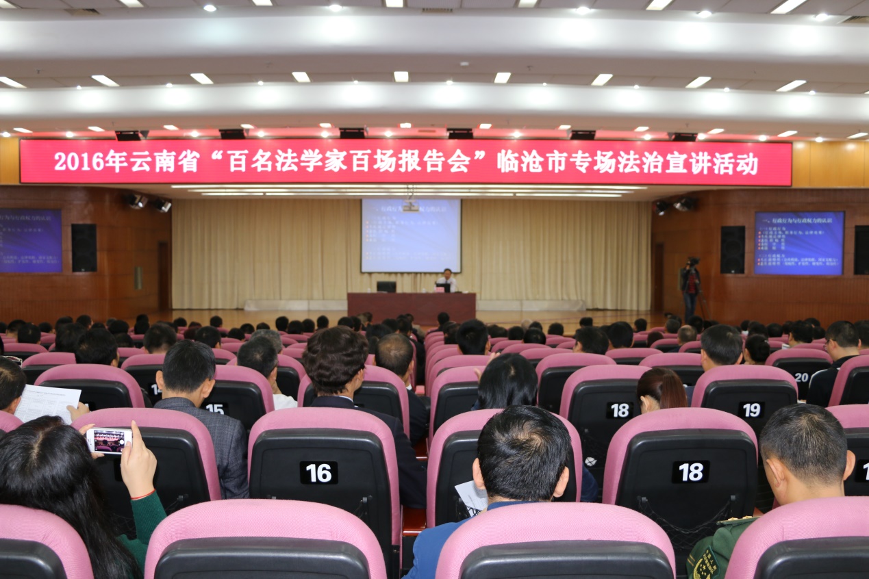 2016年11月10日,云南省“百名法学家百场报告会”临沧专场在临沧市临翔区政府会议中心举行。报告会由临沧市委政法委副书记、市法学会副会长李周主持,来自于临沧市、临翔区政法各部门和综治委成员单位的分管领导及相关人员约320余人参加报告会。