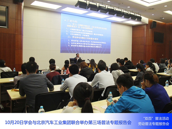 近年来,随着人们法律意识的增强,加之一些企业签订、履行用人合同不规范等问题,一些劳动者的权益得不到有效保护,劳动争议纠纷呈现多发、高发势头,不但影响社会的稳定,而且给企业的正常工作带来不利影响,同时也给劳动争议仲裁部门增加了很大的工作量。对此,依托市劳动和社会保障法学会以短期培训的形式,邀请相关领域和实务部门的专家学者为相关领域的法官、仲裁员、律师,企业人力资源部门负责人、工会干部、职工代表等讲授《调解仲裁法》有关规定、市高级人民法院《关于劳动争议案件审理若干问题会议纪要》的重点条款和涉及的真实案例等。2014年9、10月份,分三个专场,为京唐公司劳动争议调解委员会及所属13个劳动争议调解小组106名调解员;法国兴业银行(中国)有限公司、西屋(北京)企业管理有限公司、北京阜外医院管理有限公司等中外95家企业的110名人力资源管理人员;北京汽车工业集团工会所属企业劳动争议调解员和工会干部120余人,讲解劳动关系和责任主体的认定以及劳动合同的订立、履行、变更、解除、终止等相关内容,介绍劳动争议调解和劳动争议案件解决实例、社会保险政策等,促进了各级劳动争议调解员政策水平和业务素质的提高,为劳动争议调解关口前移,及时把矛盾化解在源头,营造企业和谐稳定劳动关系,维护职工合法权益发挥了积极作用。几年来,成功探索出的“劳动争议案例研讨”、“法律服务基层公益行”、“消费纠纷解决绿色通道”等法治宣讲品牌项目,产生了良好的社会影响力。