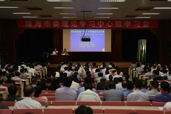 2014年11月27日下午,广东省珠海市法学会联合市委宣传部、市委政法委、市司法局成功举办第二届“珠海法律大讲堂”暨“百名法学家百场报告会”法治宣讲活动,邀请中国社会科学院学部委员、法学研究所所长李林同志给全市领导干部作了“全面推进依法治国,加快建设法治中国——学习十八届四中全会《决定》的心得体会”的专题辅导。省委常委、市委书记李嘉同志,市人大常委会主任王广泉同志等省、市领导和市法学会会长关玉嘉同志出席了报告会,市委常委、市纪委书记王衍诗同志主持了本次报告会。