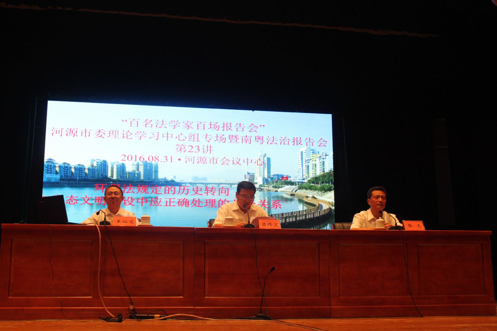 8月31日上午,“百名法学家百场报告会”河源市委理论学习中心组专场暨“南粤法治报告会”第二十三讲在河源市会议中心举行。中国政法大学环境资源法研究所所长王灿发教授作主题为《环保法规定的历史转向与生态文明建设中应正确处理的几个关系》的专题报告。