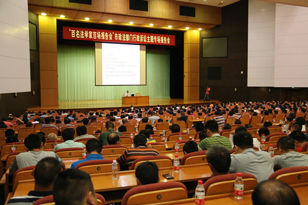 11月6日上午,东莞市在市会议大厦举行“百名法学家百场报告会”(简称“双百”)市政法部门行政诉讼主题专场报告会,邀请广东省高级人民法院审判委员会委员、国家赔偿委员会副主任、行政庭庭长付洪林同志为市直政法各单位和各镇(街道)领导干部作报告。东莞市委常委、政法委书记邓志广同志出席并主持了报告会,市委政法委委员,市直政法各单位(含基层法院、基层检察院)分管领导,各镇(街道)党委政法办主任、专职副主任、村(社区)治保主任,松山湖(生态园)维稳及综治办主任、专职副主任,市委政法委机关正科级以上干部,共710多人参加了报告会。