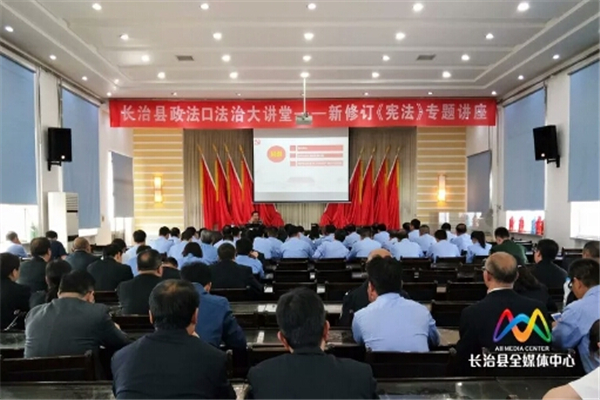 根据中央、省委、市委和县委关于深入学习宣传贯彻实施宪法的部署,按照《2018年“百名法学家百场报告会”法治宣讲活动指导意见》的要求,5月3日下午,长治县委政法委、长治县法治建设工作领导小组办公室、长治县法学会联合举办了政法口法治大讲堂暨2018年“双百”法治宣讲首场报告会--新修订《宪法》专题讲座,参加今天学习讲座的领导有县委常委、政法委书记、县法学会会长张芬芬,县法院院长李建平,以及县政法各单位领导班子成员、科股长、基层派出所、司法所负责人、县法学会会员共计120人。讲座由县委政法委常务副书记、综治办主任、县法学会副会长郭联珍主持。